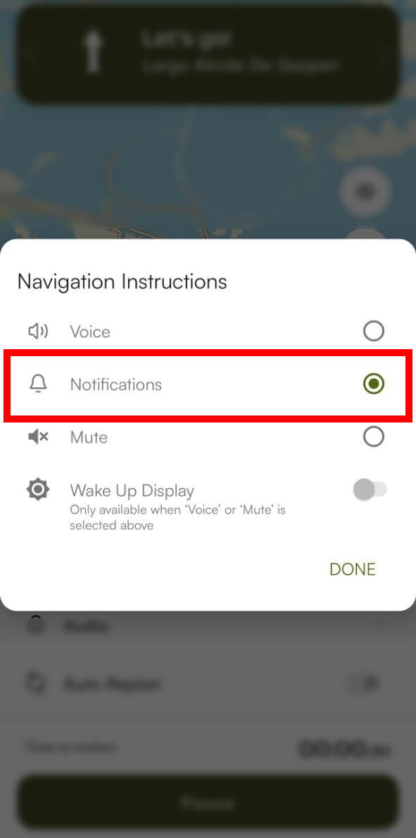 1) To enable Komoot notificatons on your phone please open the running Navigation route, open the Audio settings and enable the Notifications mode.